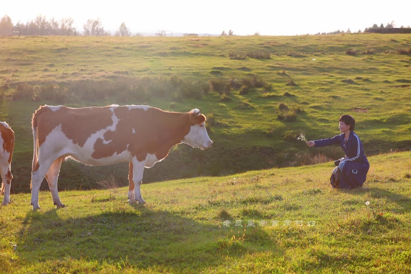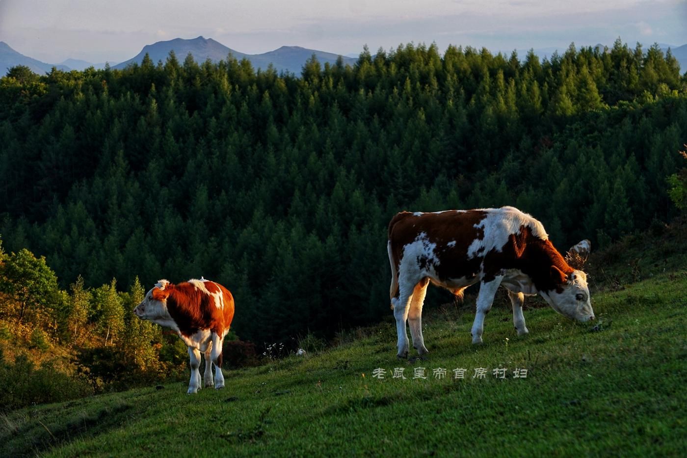 高山草甸如绿绒毯,棕白相间的牛儿在悠然吃草,项间铜铃作响,等你走近了,它们也不会在第一时间逃跑,而是站定了跟你对视,懵懂憨厚,特别可爱,其实这也说明当地人和动物的和谐。