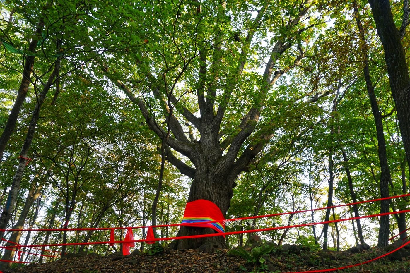 而且,我们有两个额外彩蛋,一是岭上枫林有棵2000年的古橡树,官方资料显示:高25米,胸围4.8米,根部5.8米,当地人说树干上的黑色结点代表的是橡树为人类挡掉的灾难,结结越大,代表灾难越大。感恩这棵古老的橡树2000年的守护。