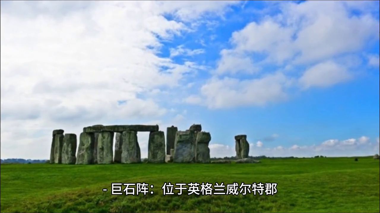 ·巨石阵:位于英格兰威尔特郡,是史前文化神庙遗址,建于西元前4000年,属新石器时代末,也是世界上最著名的史前遗址之一。