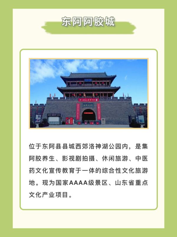 4、东阿阿胶城,位于东阿县县城西郊洛神湖公园内,是集阿胶养生、影视剧拍摄、休闲旅游、中医药文化宣传教育于一体的综合性文化旅游地。现为国家AAAA级景区、山东省重点文化产业项目,是“到山东不得不去的100个地方”之一。景区依山傍水,风景秀美,主要景点有大宅门影视基地、贡胶馆、阿胶亭等。