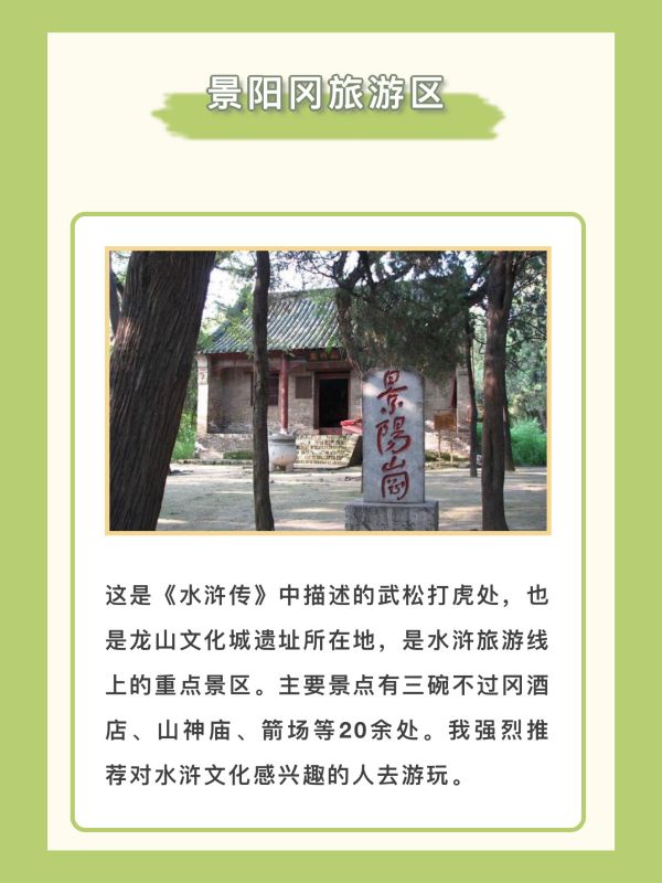 这是《水浒传》中描述的武松打虎处,也是龙山文化城遗址所在地,是水浒旅游线上的重点景区。主要景点有三碗不过冈酒店、山神庙、箭场等20余处。我强烈推荐对水浒文化感兴趣的人去游玩。