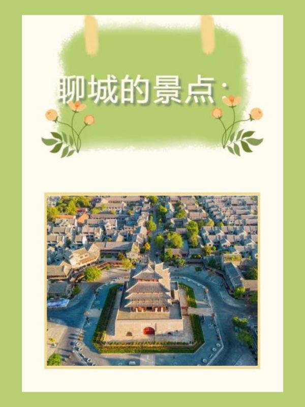 1、聊城狮子楼,位于阳谷县旧城中央十字街首。主要景点有:王婆茶馆、武大郎家、冷酒馆、纸扎店、西门药店、盐店、绒线铺、绸缎庄、客栈、狮子大酒楼、棋社、戏台、玉皇庙等。节日期间举行大型的节庆和庙会等活动。日常娱乐项目有山东快书、武大郓哥大街表演、阳谷风情表演、舞狮子、踩高跷、老年秧歌表演、豫剧团演出、民间杂耍表演、糖人表演、书法表演,工艺品制作表演等。