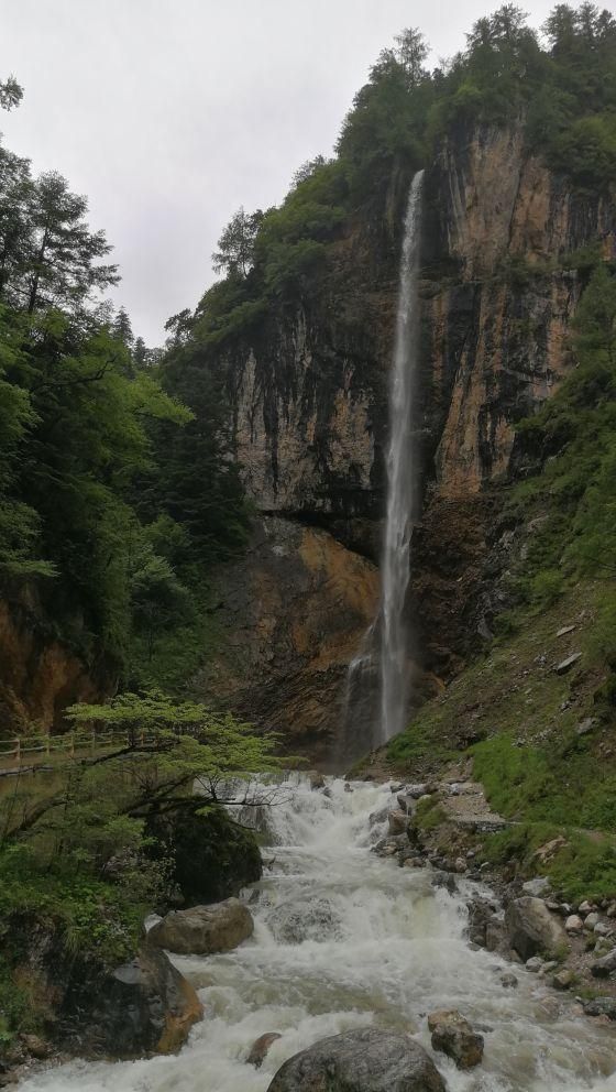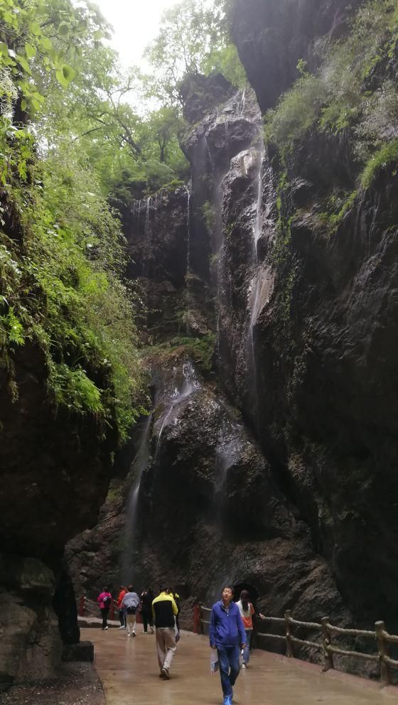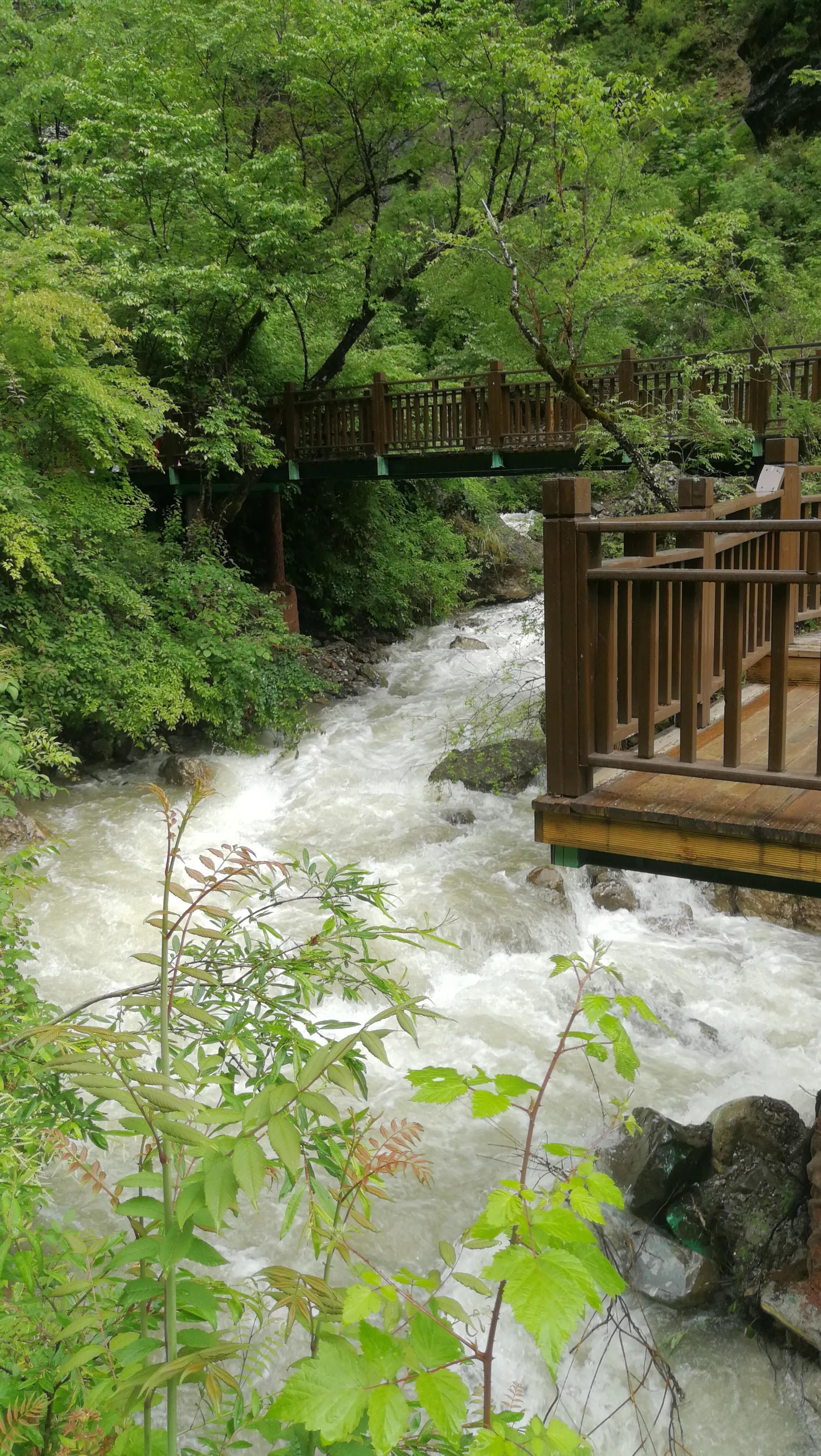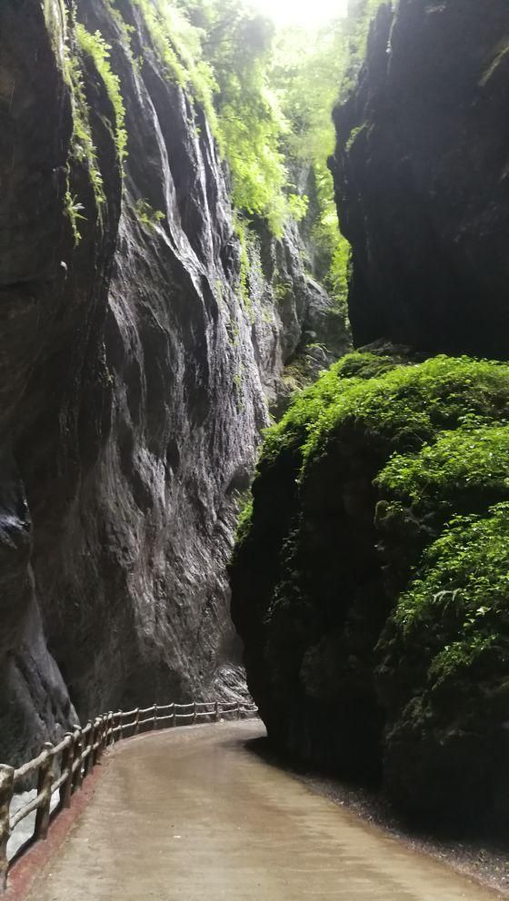 大巴停在通天门游客服务中心,f是峡谷,只能靠双脚来丈量了。进入峡谷有两条路线,一条架设在河流上的木栈道,一条沿河的水泥路,我们选择沿河而入,走过一小段后,路上满是流水,普通的鞋子很快就进水了。