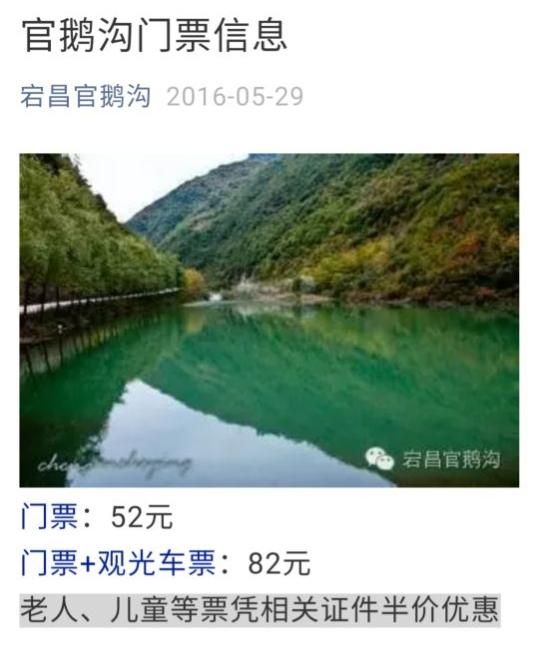 途中山峦起伏,云雾缭绕,高速上车辆很少,路遇一隧道前方有事故,换魁驾车,以防他车挤入前行的行列。等待十几分钟后通过,车程大概六小时,下午两点多到达官鹅沟景区,这里只是阴天,雨已经停了,查公众号票务信息显示门票52元,门票加观光车票82元(截屏为证)