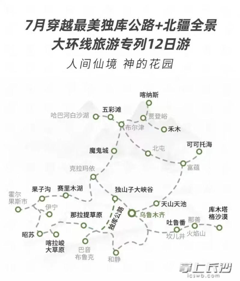 长沙晚报掌上长沙6月6日讯(通讯员 汤志强)夏天是旅游的旺季,中国最美的风景都藏在新疆的夏天里。“晚报带你去旅行”推荐“穿越最美独库公路+北疆全景大环线目的地旅游专列12日游”,7月将从长沙出发,用12天的时间(北疆当地8天),看天山以北的盛夏盛景,这是一条涵盖北疆所有经典美景的深度游线路,旅游专列依然是跟团游打开新疆的绝佳方式。一趟专列,走遍北疆大众热门景点,非常适合在暑假带孩子一起参加。
