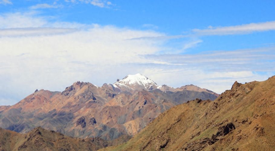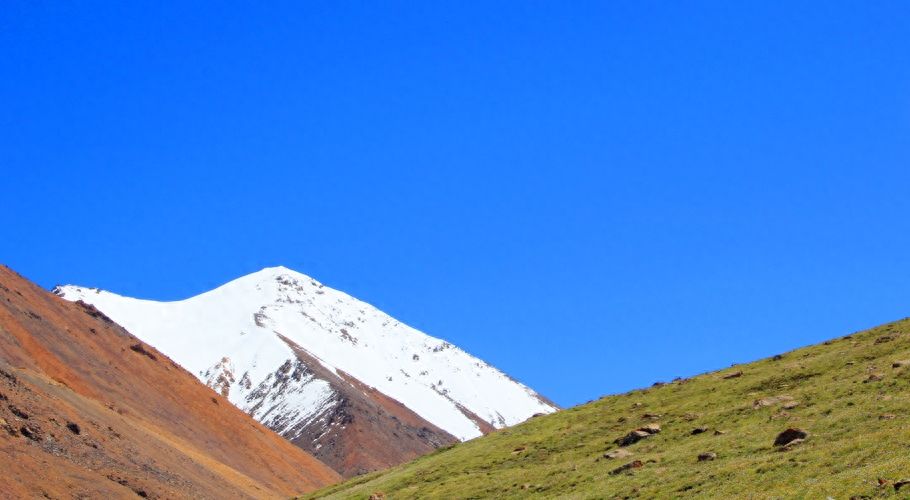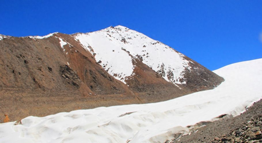 倾斜的山坡,冰川像被施了定身术的奶油,流淌到一半就被迫定住,保持着流动的形态。烈日下,冰川消融,形成雪水,顺着斜坡,汇成小溪。