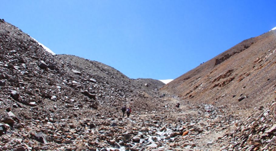 冰舌延伸于山谷中,距离我们所在山体有几十米深。为了亲手触摸冰川,我们小心翼翼的沿着乱石,自行开辟道路,向下,向下,再向下,朝着冰舌不断靠近。
