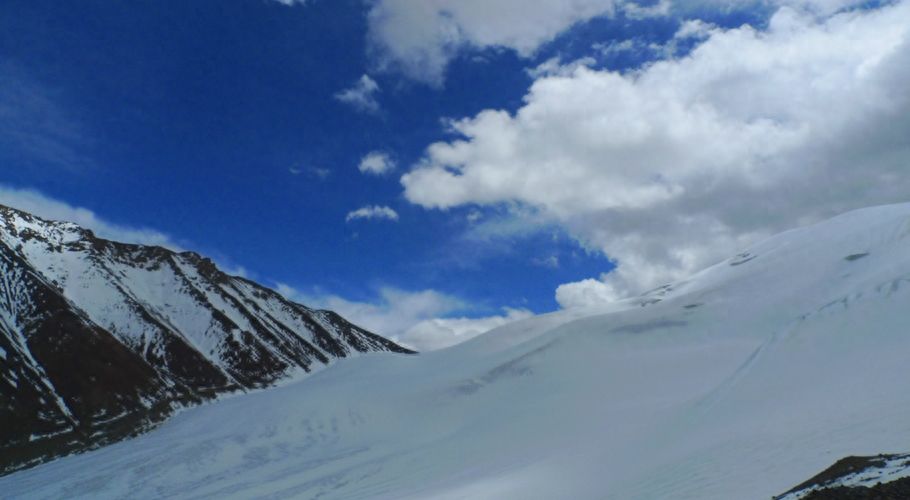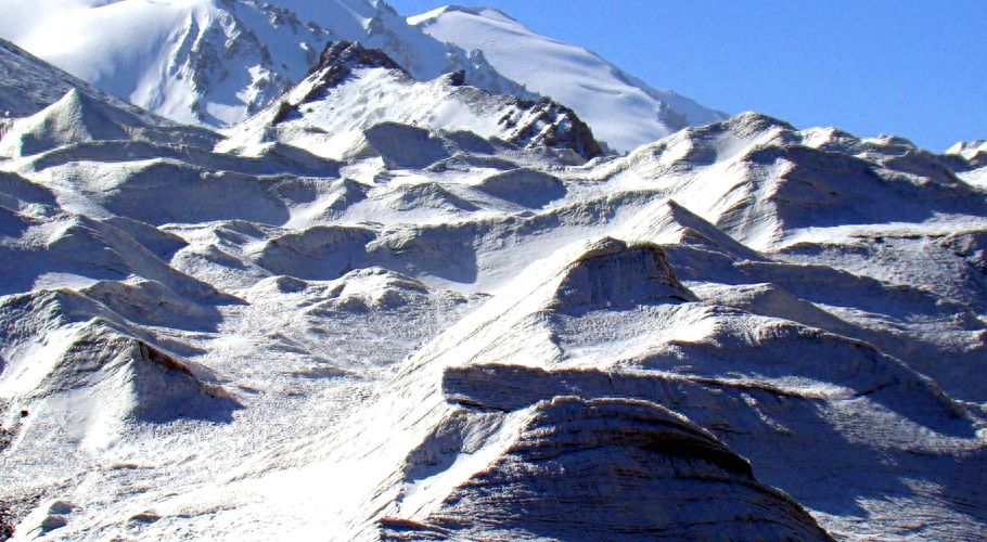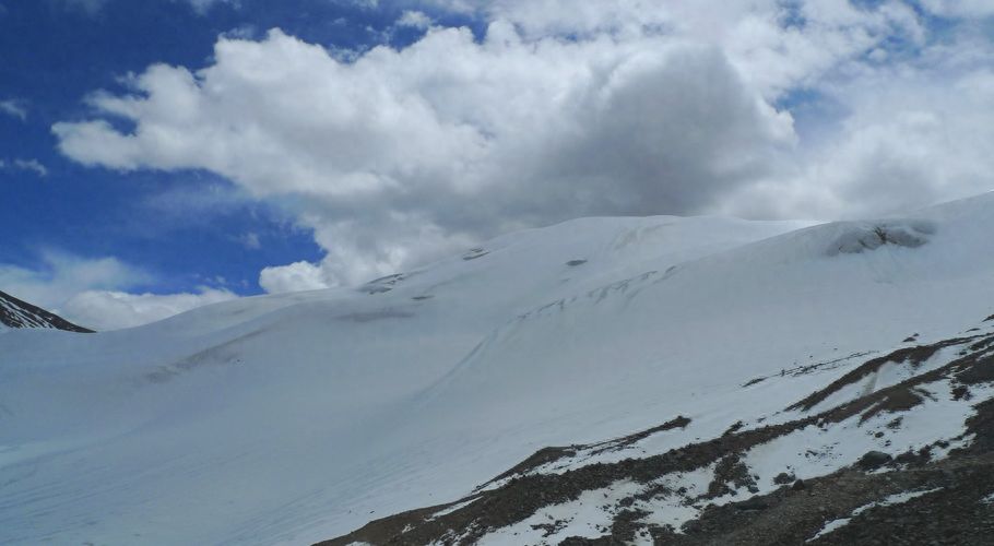 哇,壮观!极其壮观!只见冰川斜挂在45度的山坡上,绵延数公里,彷佛神仙打泼的老酸奶,顺着山坡流动着,起伏着。雪白夹杂着灰白的雪山冰川,黝黑的岩石,湛蓝的天空,还有那些随风变幻的云朵,构成了壮丽绝美的景色。