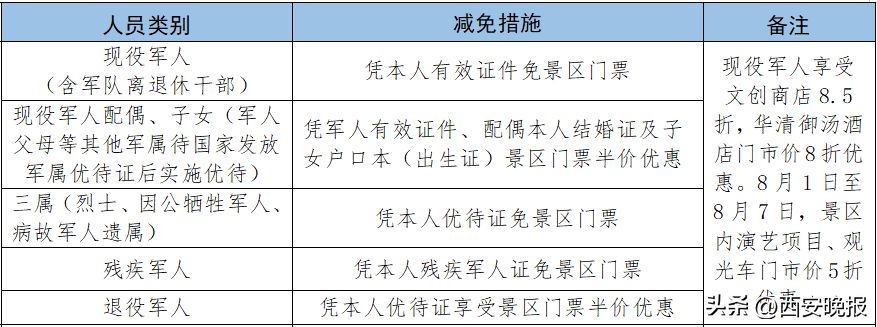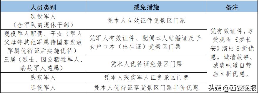现役军人及随行家属(2位)三属(烈士、因公牺牲军人、病故军人遗属)退役军人(含军队 离退休干部)、残疾军人可免费观看《夜谭·白鹿原》《黑娃演义》 《二虎守长安》 演出。