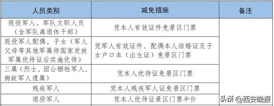 4.现役军人、军队离退休干部、军队院校学员、军残人员凭有效证件(军官证、离退休证、文职干部证、士官证、士兵证等)实行免票。