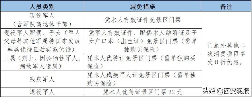 1.现役军人本人所携的配偶和18岁以下未成年子女,凭结婚证、户口本等有效证件实行门票免费或免预约;