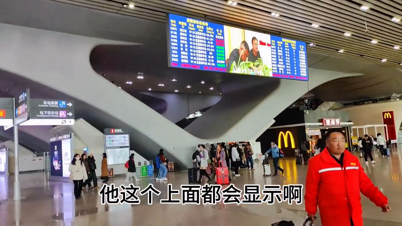 所以大家一定要知道怎么去候车,一定要去三层候车。有些朋友说了,我过来接人,怎么接?接人就在现在小梅所在的位置一层这里进行接人。这上面蓝色公告栏上面都会显示哪趟列车,哪趟列车几点到站,几点出发,就要留意了,不然都不知道从哪里去接亲朋好友了。