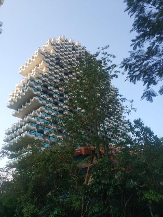 第二天去了亚龙湾热带天堂森林公园,就在亚龙湾海滩附近,打了的士过来的,套票是司机代买的,比某团便宜10块钱。个人感觉里面植物景色就一般,但里面的全海景玻璃栈道景点还是很让人留恋的,站在玻璃桥上,可以看亚龙湾,景色很漂亮。另外过江龙索桥景点也不错,索桥很长跨度大,在桥上就不要带太阳帽了,容易被风吹掉,在索桥上还是很刺激的。亚龙湾热带天堂森林公园曾经是《非诚勿扰2》取景地,里面有《非诚勿扰2》试婚房参观,但是需要另外收费。XD雨林魔幻影院观影效果类似于4D,可以感受一下热带雨林景观的神奇。里面有一个自费项目,个人感觉滑索项目还不错,虽然价格300多,但是如果你喜欢刺激,可以体验一下。还有一个景点是沧海楼,风格类似于岳阳楼,站在上面,可以观看亚龙湾。