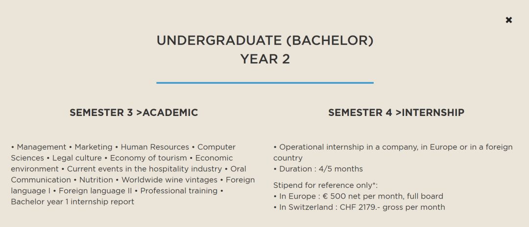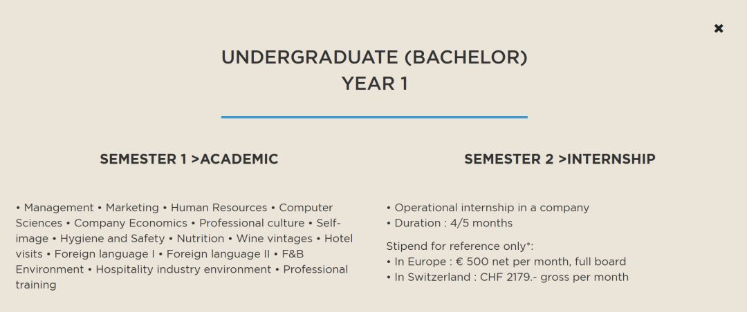 课程:管理 - 市场营销 - 人力资源 - 计算机科学 - 法律文化 - 旅游经济 - 经济环境 - 酒店业时事 - 口语交流 - 营养学 - 世界葡萄酒酿造 - 外语I - 外语II - 专业培训 - 本科一年级实习报告