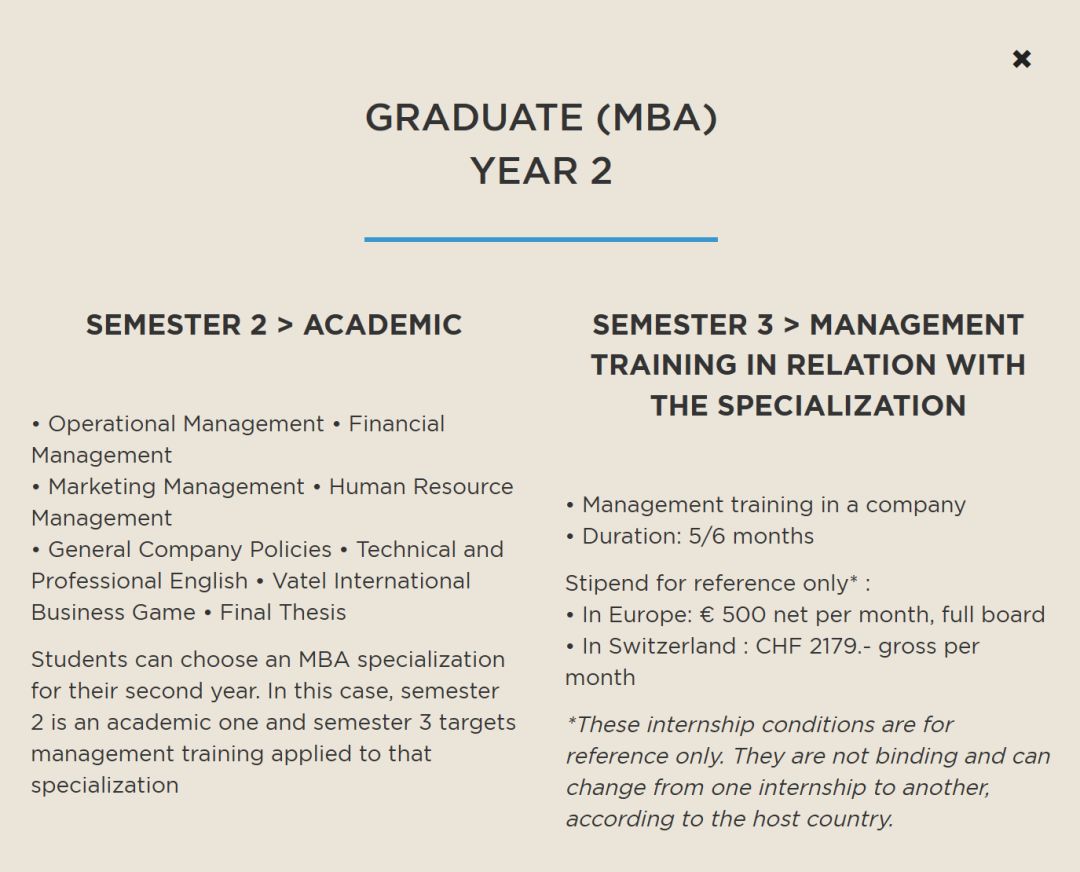 PS:学生可以在第二年选择一个MBA专业。在这种情况下,第二学期一般是学术课程,第三学期是应用于该专业的管理培训。