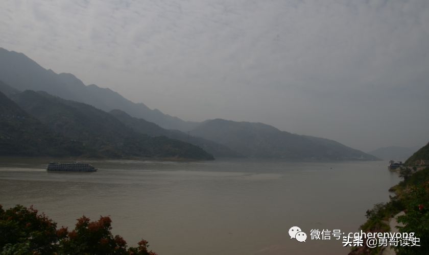 当天下午,我们参观完白帝城景区,沿原路返回来。在经过廊桥时,我回头拍了最后一张照片。在浩浩荡荡的江水中,一艘旅游轮船正在溯江而上。天空布满了白云,江边红色的花朵开得很艳。