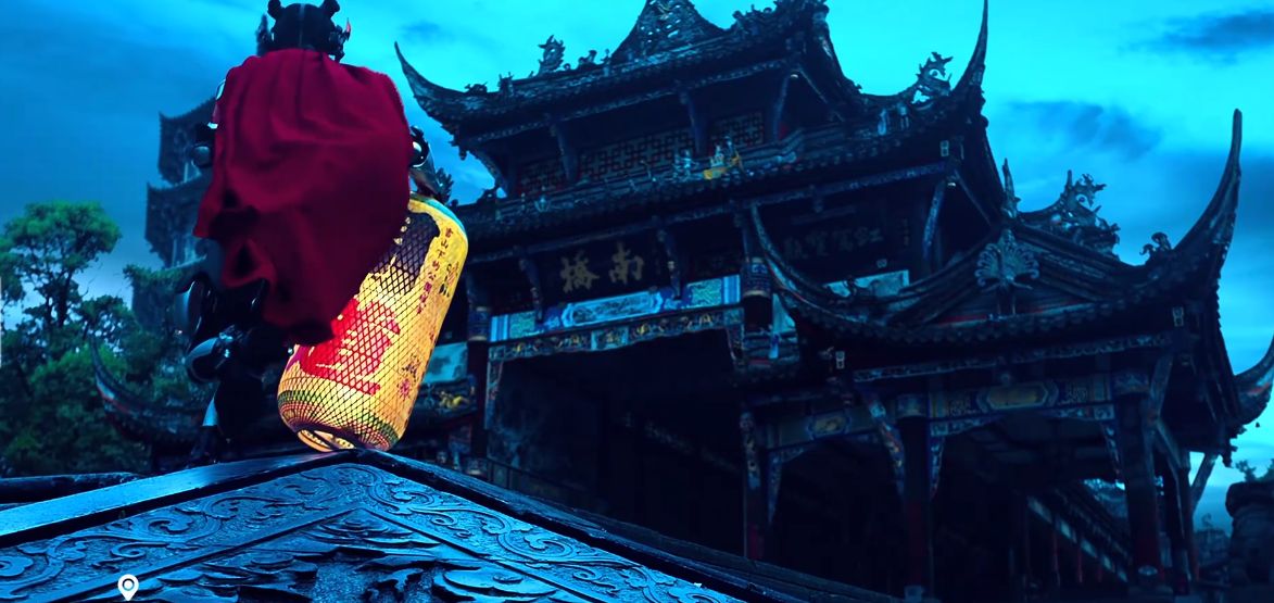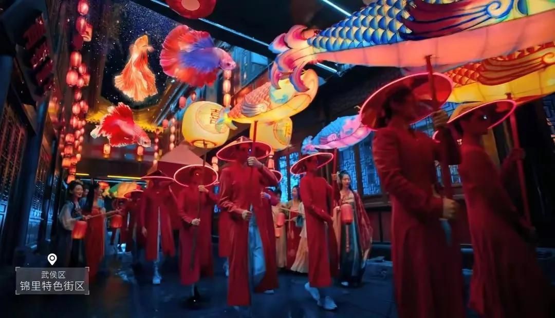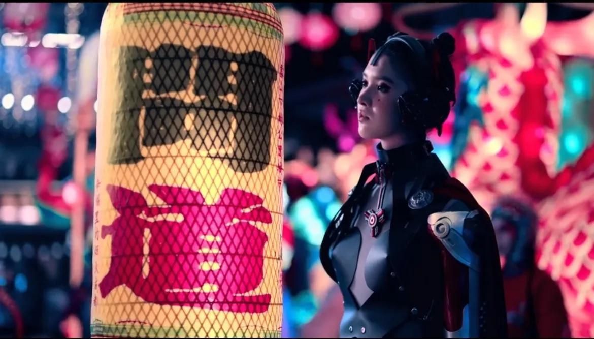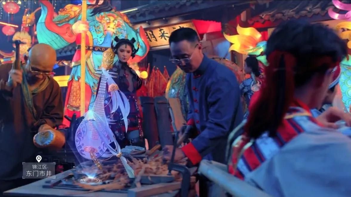 视频中,一个赛博朋克风格的女孩出现在了镜头前,女孩提着一盏巨大的灯笼,在人群中穿梭,为大家介绍着成都最有特点的建筑、景观、文化。