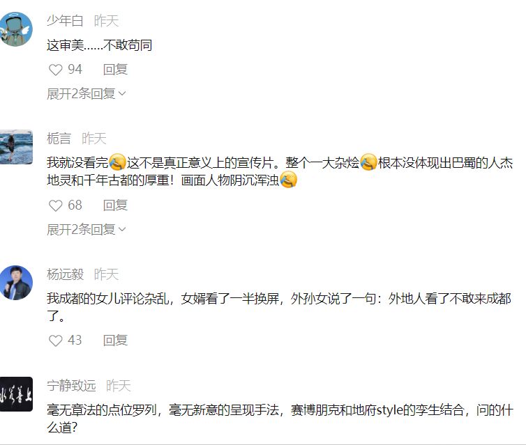 一方说,这个宣传视频不仅没有贴近现实,反而非常贴近地府。还有人认为,这是一部充满了高科技的电影,很适合成都,但这是一部什么样的电影?竟然会有两个完全不同的评价。