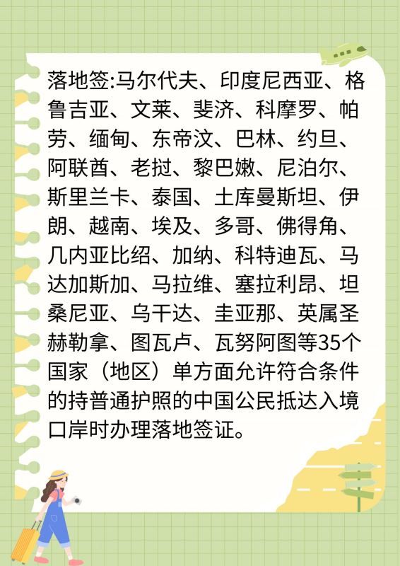 落地签:马尔代夫、印度尼西亚、格鲁吉亚、文莱、斐济、科摩罗、帕劳、缅甸、东帝汶、巴林、约旦、阿联酋、老挝、黎巴嫩、尼泊尔、斯里兰卡、泰国、土库曼斯坦、伊朗、越南、埃及、多哥、佛得角、几内亚比绍、加纳、科特迪瓦、马达加斯加、马拉维、塞拉利昂、坦桑尼亚、乌干达、圭亚那、英属圣赫勒拿、图瓦卢、瓦努阿图等35个国家(地区)单方面允许符合条件的持普通护照的中国公民抵达入境口岸时办理落地签证。