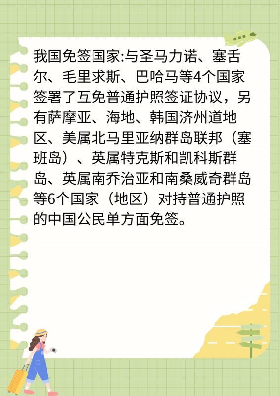 我国免签国家:与圣马力诺、塞舌尔、毛里求斯、巴哈马等4个国家签署了互免普通护照签证协议,另有萨摩亚、海地、韩国济州道地区、美属北马里亚纳群岛联邦(塞班岛)、英属特克斯和凯科斯群岛、英属南乔治亚和南桑威奇群岛等6个国家(地区)对持普通护照的中国公民单方面免签。