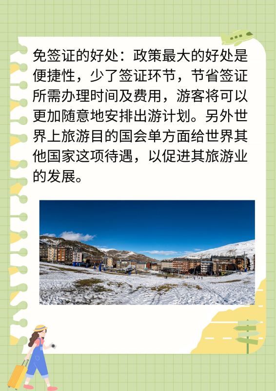 免签证的好处:政策最大的好处是便捷性,少了签证环节,节省签证所需办理时间及费用,游客将可以更加随意地安排出游计划。另外世界上旅游目的国会单方面给世界其他国家这项待遇,以促进其旅游业的发展。
