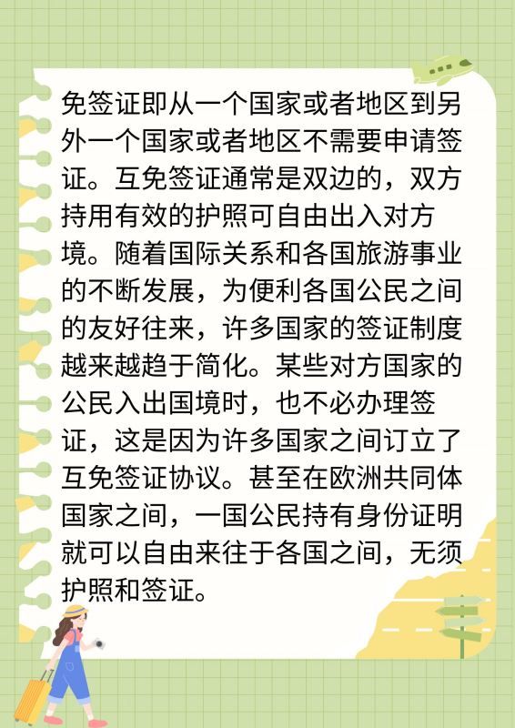 免签证即从一个国家或者地区到另外一个国家或者地区不需要申请签证。互免签证通常是双边的,双方持用有效的护照可自由出入对方境。随着国际关系和各国旅游事业的不断发展,为便利各国公民之间的友好往来,许多国家的签证制度越来越趋于简化。某些对方国家的公民入出国境时,也不必办理签证,这是因为许多国家之间订立了互免签证协议。甚至在欧洲共同体国家之间,一国公民持有身份证明就可以自由来往于各国之间,无须护照和签证。