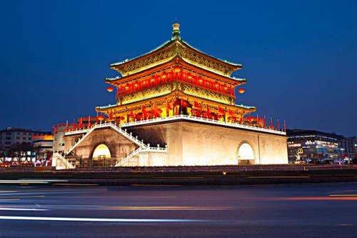 钟楼:位于西安市中心,建于明1384年,高36米,外部重檐3层,但内部仅上下两层,是我国古代木结构建筑,一个巨大的钟被装置在楼上原用于报警报时。