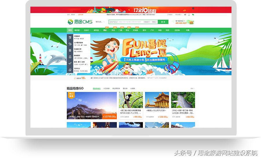 这套模板和思途主流门户模板类似,都适用于综合型门户网站。但这套新出的模板,还是和上一套主流门户模板有一定的区别。我们都知道,现在用户的口味是日新月异,我们的旅游网站,自然也不能再一成不变了。有的朋友可能已经使用了一段时间思途的主流门户模板,那就可以考虑改换这套更新一点的模板了。这套模板,看起来,确实更加的美观了。从细节上来说,在产品字段新增“满意度”展示,或显示团购商品倒计时等方式,也更能吸引用户的注意。大家也可以对比一些其他网站的模板,排版样式往往非常单一,对于我们多产品的网站来说,用户在长时间的浏览中很容易产生视觉疲惫,而这套模板,就专门进行了不同版块的式样区分,用户体验也就更人性化哦!