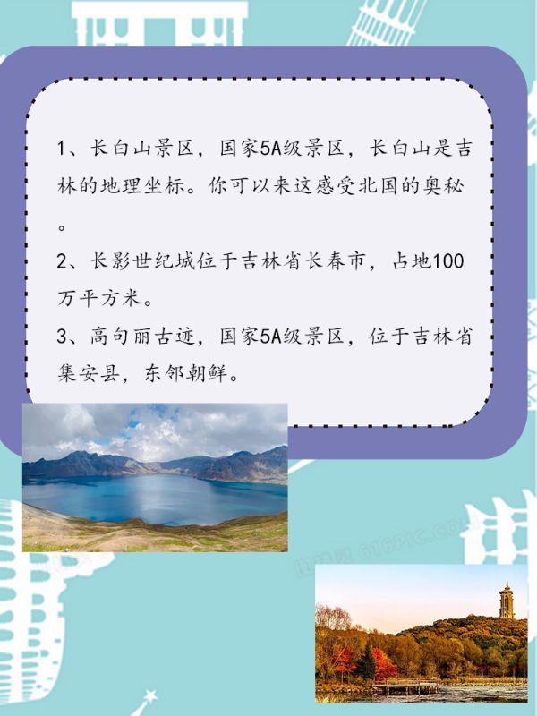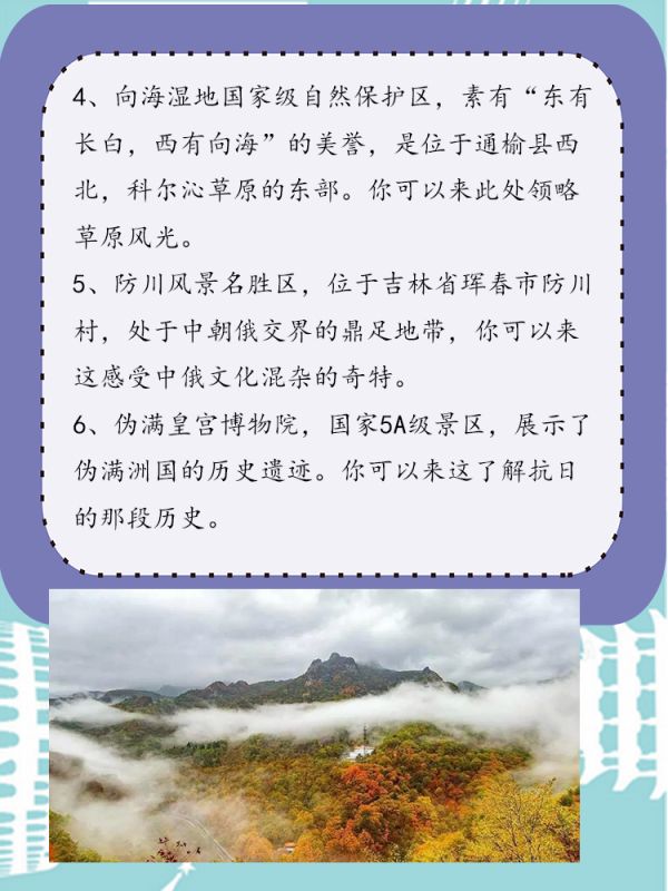 吉林是中国东北地区的一个省份,拥有丰富的自然景观和独特的文化遗产。以下是一些吉林省的著名景点和好玩的地方: