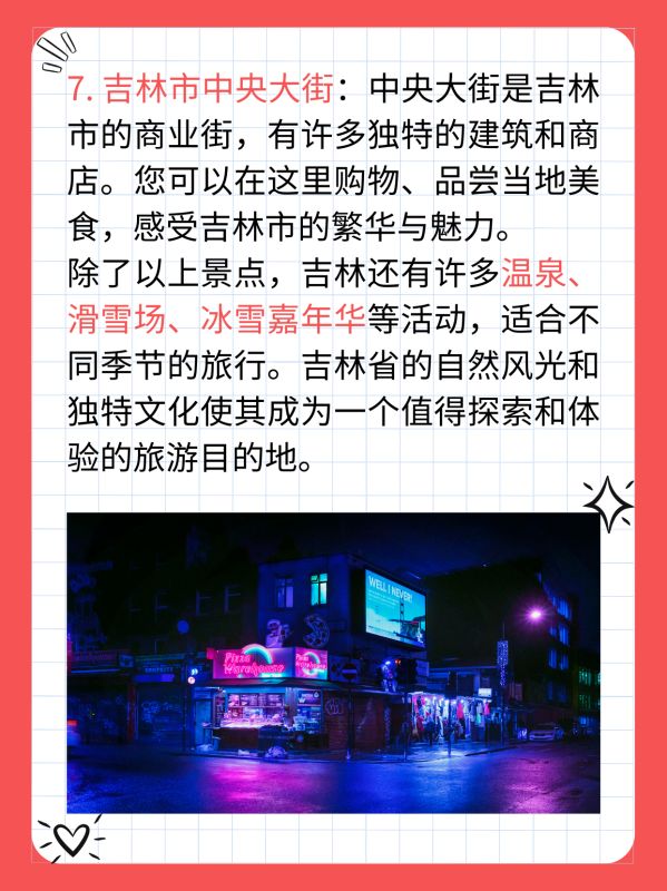 除了以上景点,吉林还有许多温泉、滑雪场、冰雪嘉年华等活动,适合不同季节的旅行。吉林省的自然风光和独特文化使其成为一个值得探索和体验的旅游目的地。