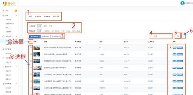 ①板块1可以选择全部、旅游线路、酒店客栈、景点门票4种方式管理商品
