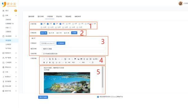 ①板块1可选择不同模块进行内容编辑,如:基础信息、图文详情、行程信息、预订须知、保险类型