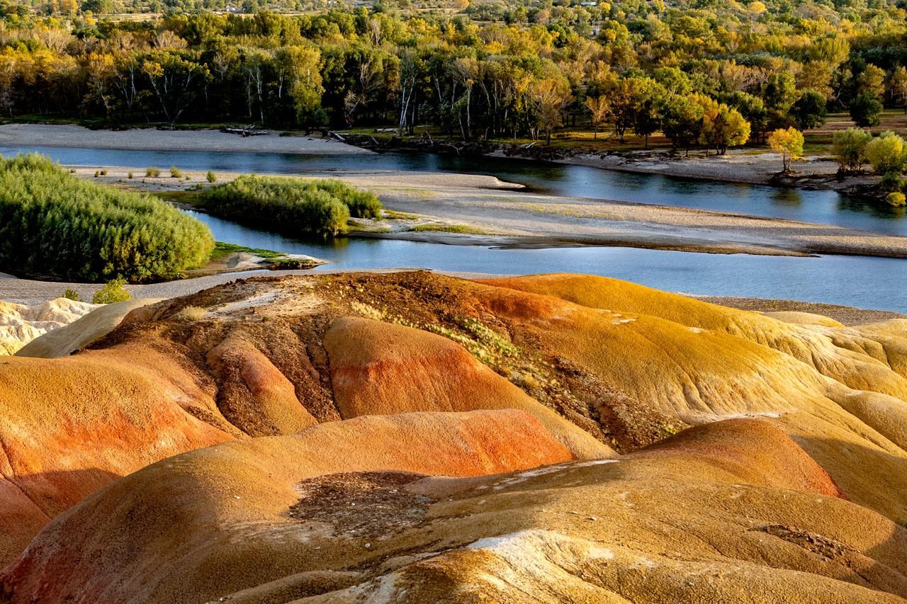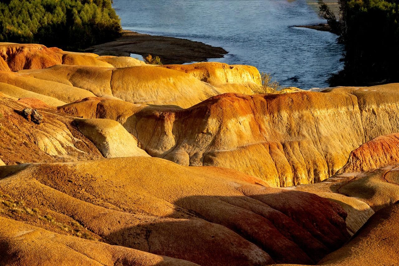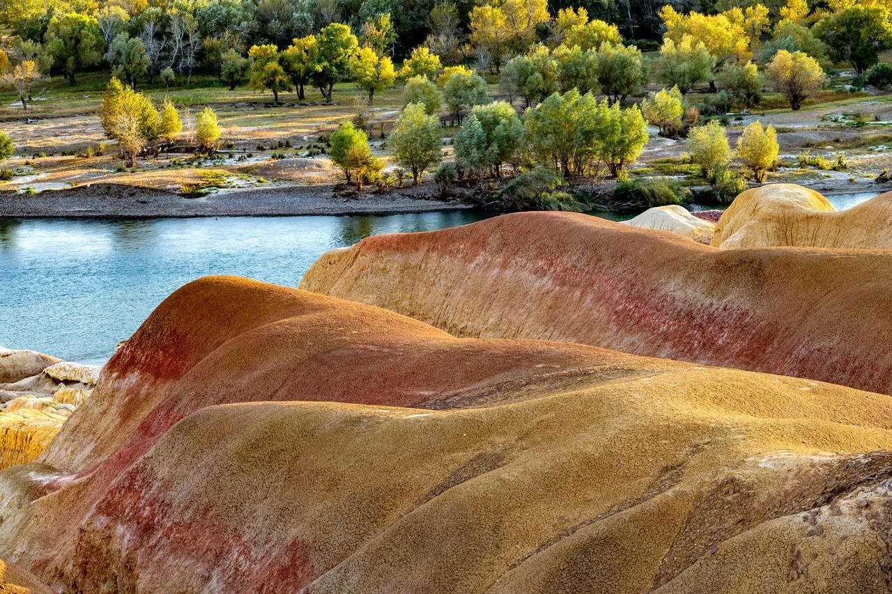 新疆布尔津的五彩滩,夕阳西下,金黄色一片,映照在雅丹地貌上,额尔齐斯河对岸,郁郁葱葱,远处山峦逶迤,戈壁茫茫,正所谓“一河两重天”。