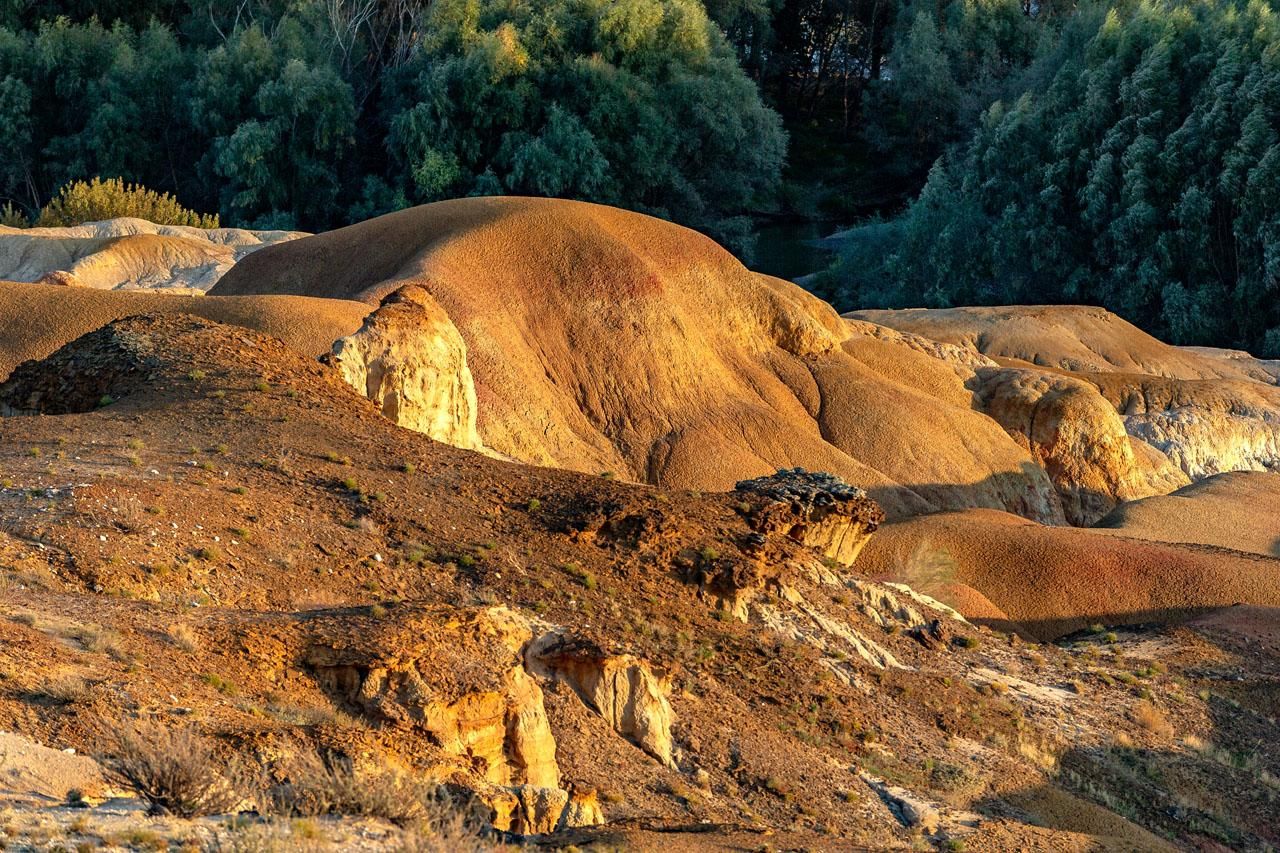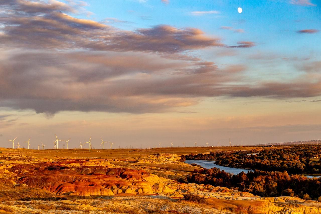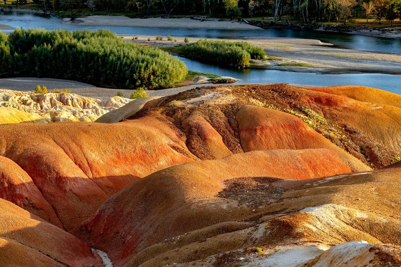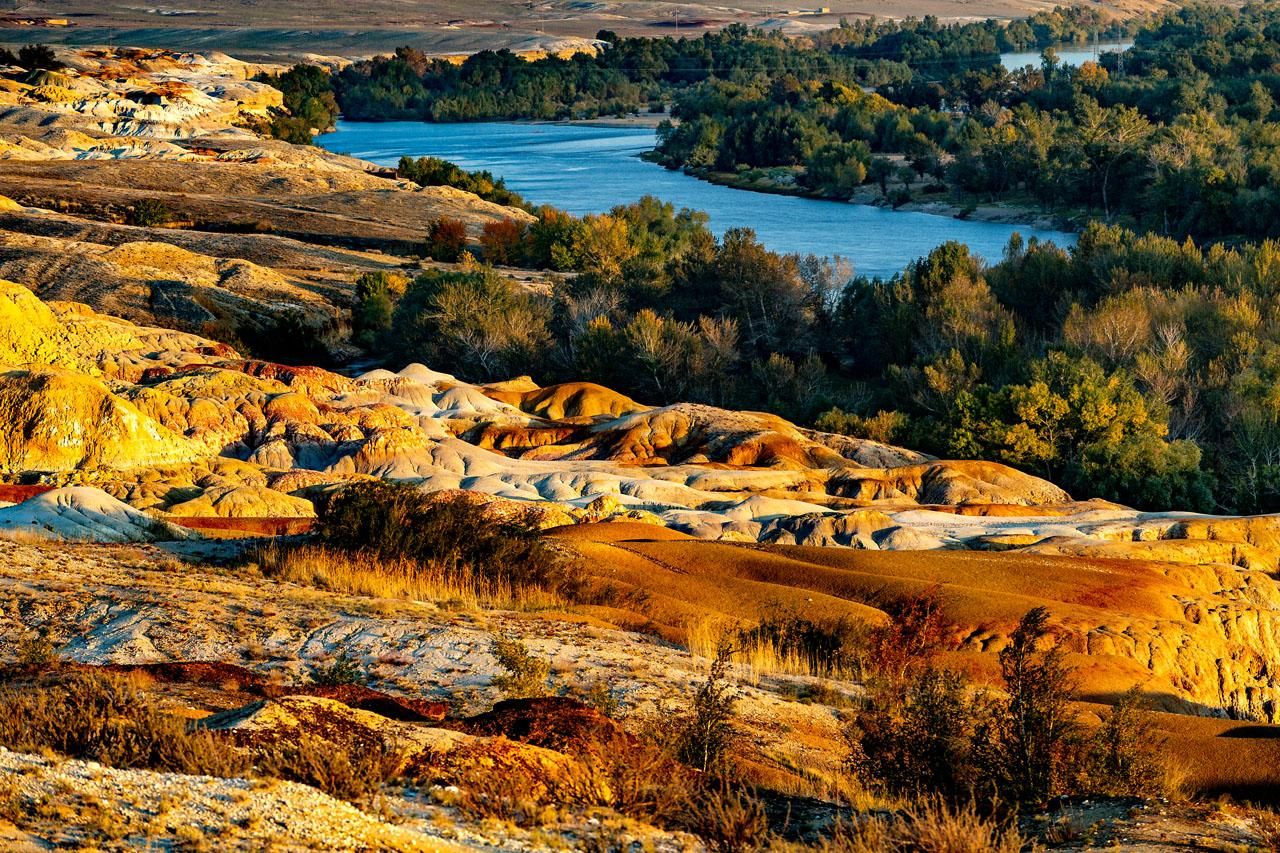 新疆布尔津的五彩滩,夕阳西下,金黄色一片,映照在雅丹地貌上,额尔齐斯河对岸,郁郁葱葱,远处山峦逶迤,戈壁茫茫,正所谓“一河两重天”。