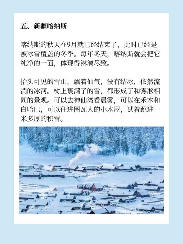 喀纳斯的秋天在9月就已经结束了,此时已经是被冰雪覆盖的冬季。每年冬天,喀纳斯就会把它纯净的一面,体现得淋漓尽致。