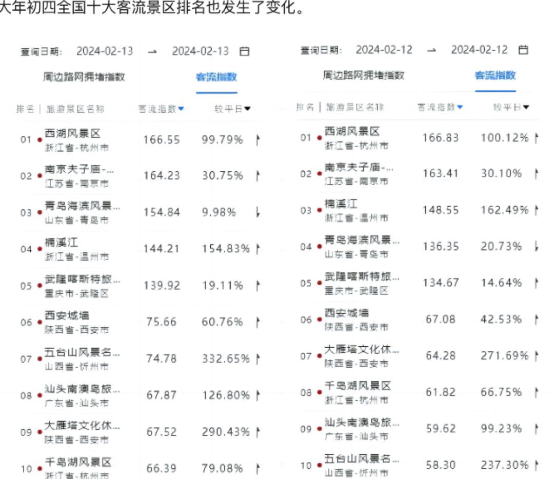 而原本位列第三的楠溪江景区则被青岛海滨风景区赶超,后者以仅次于平日的客流量位列第三,而楠溪江景区的客流量则相比平日增长了154%,较之初三有所下滑。