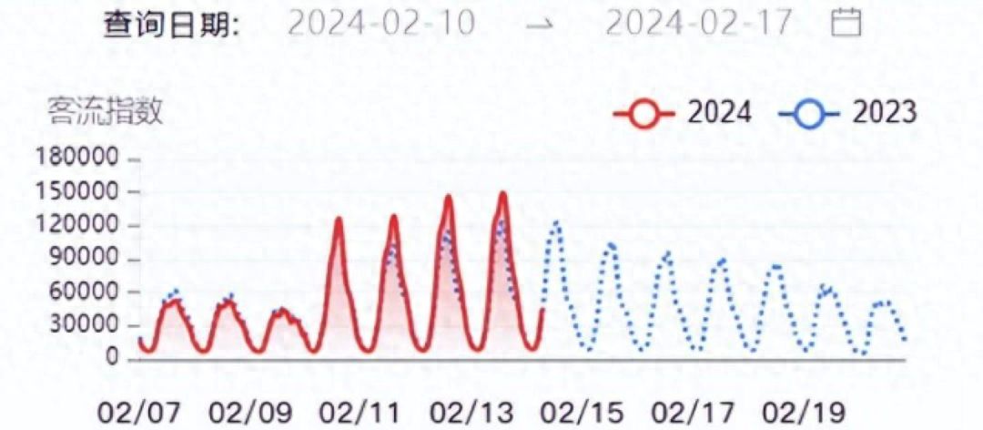 数据显示,2月10日,全国重点景区客流指数高峰达到126721.73,而到了2月13日,这个数字达到了惊人的150285.46。根据历年的景区客流监测,大年初四往往会成为春节期间客流量的最高峰,从初五开始,客流量将开始减小。