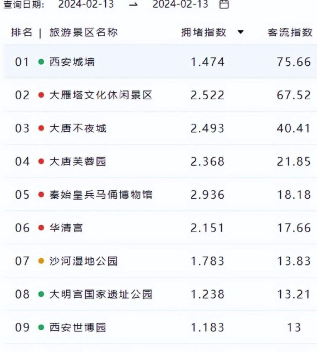 其他热门的景区包括:西安城墙(客流指数75.66)、大雁塔文化休闲景区(客流指数67.52)、太湖(客流指数35.68)和等。