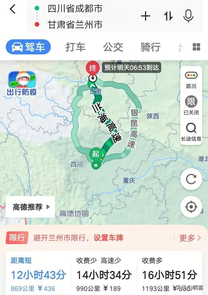交通路线:成都-锦悦西路-成都绕城高速-京昆高速-兰海高速-212国道-兰海高速-南滨河路-兰州。全长869公里,车程12小时43分。