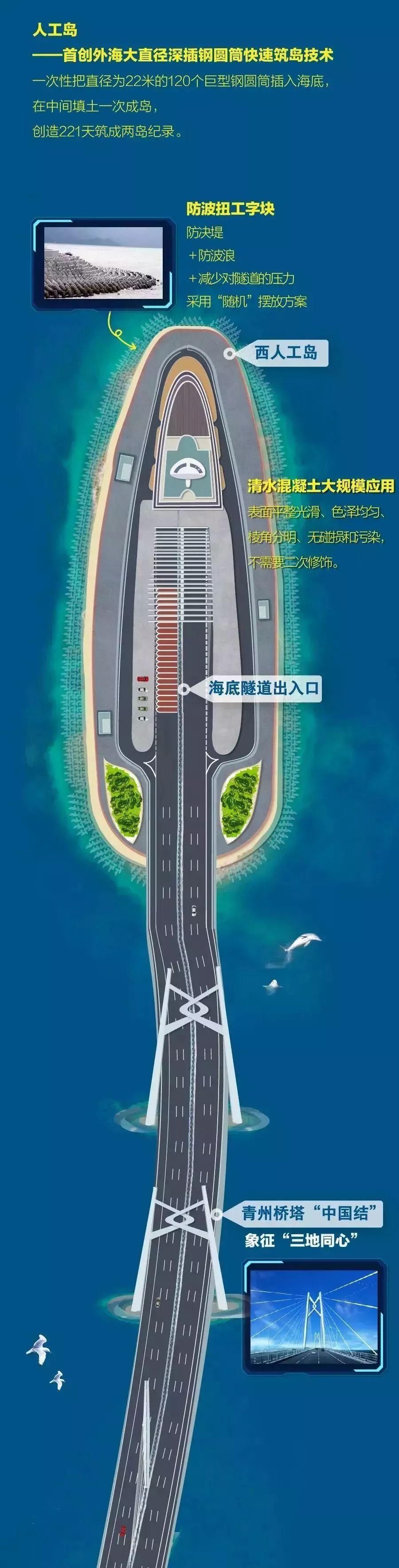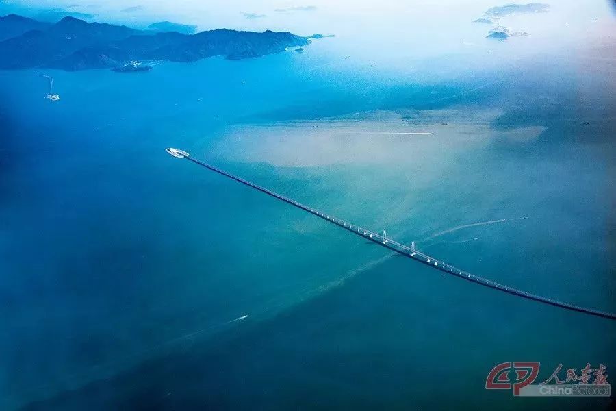 从空中俯瞰整座大桥,似两条蛟龙出海,一条向东,一条向西,相互守望。两座人工岛状似圆圆的贝壳,又如同两艘相向而行的巨轮。 摄影 段崴/人民画报