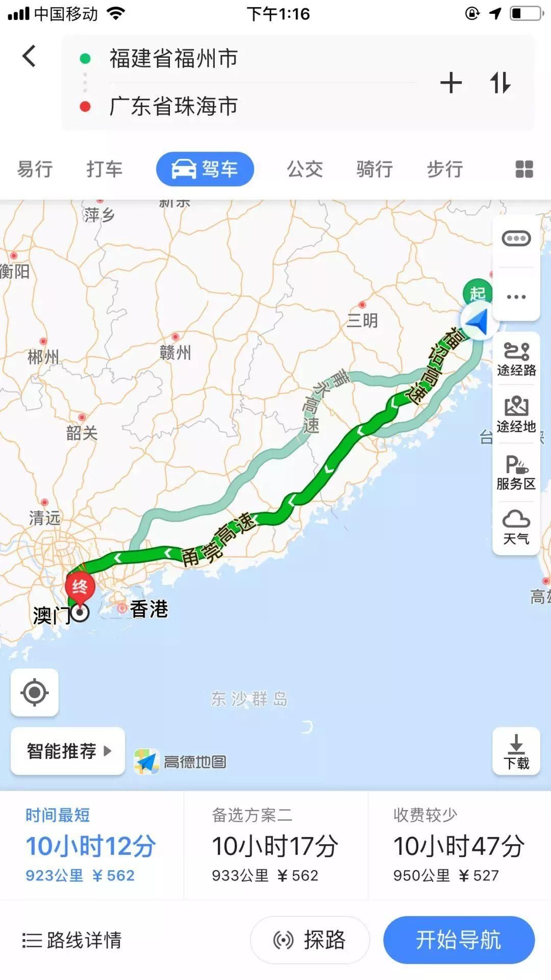 福州—福诏高速—厦沙高速—厦门绕城高速—福诏高速—莞佛高速—广澳高速,全程923公里,耗时10小时12分。