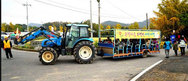 并且每年的十月底,银杏村子里还有一个盛大的“银杏节庆”,当地人叫做“银杏祝祭”,届时会吸引韩国周边的许多省市居民前去参加。村子里人们还把巨型的拖拉机改造成风景观光车,突突的带着游客观览整个村子的美丽。