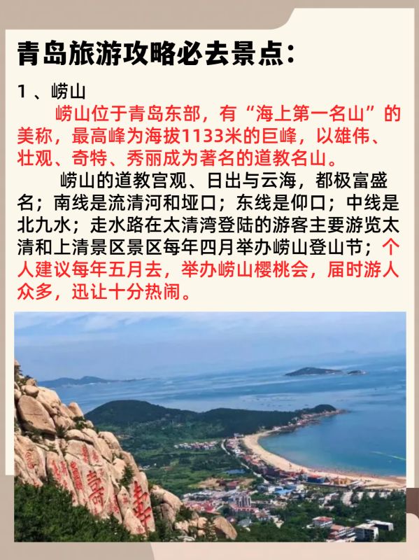 崂山的道教宫观、日出与云海,都极富盛名;南线是流清河和垭口;东线是仰口;中线是北九水;走水路在太清湾登陆的游客主要游览太清和上清景区景区每年四月举办崂山登山节;个人建议每年五月去,举办崂山樱桃会,届时游人众多,迅让十分热闹。