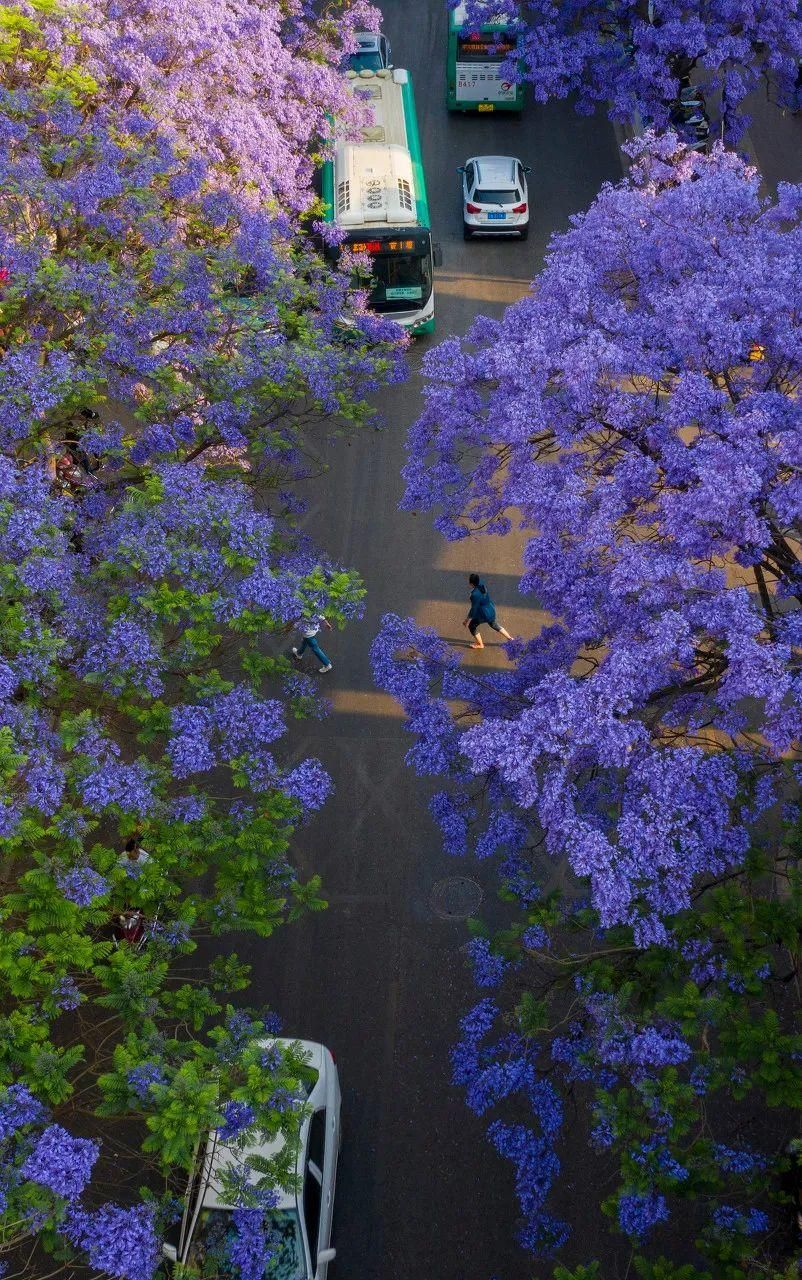 全城皆是浪漫的花海!车来车往的马路,遮盖在紫色巨伞下,恍惚间,以为自己踏进了宫崎骏的漫画里。