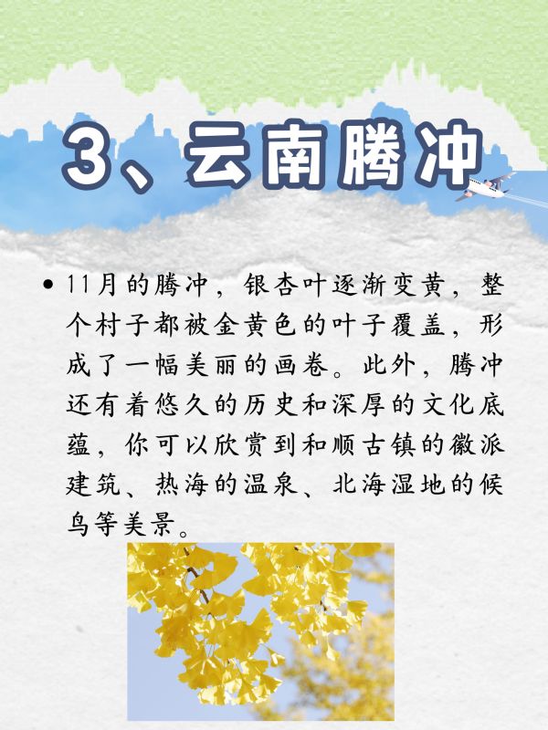 11月的腾冲,银杏叶逐渐变黄,整个村子都被金黄色的叶子覆盖,形成了一幅美丽的画卷。此外,腾冲还有着悠久的历史和深厚的文化底蕴,你可以欣赏到和顺古镇的徽派建筑、热海的温泉、北海湿地的候鸟等美景。