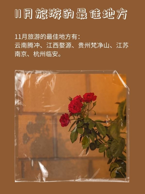 11月旅游的最佳地方有:云南腾冲、江西婺源、贵州梵净山、江苏南京、杭州临安。