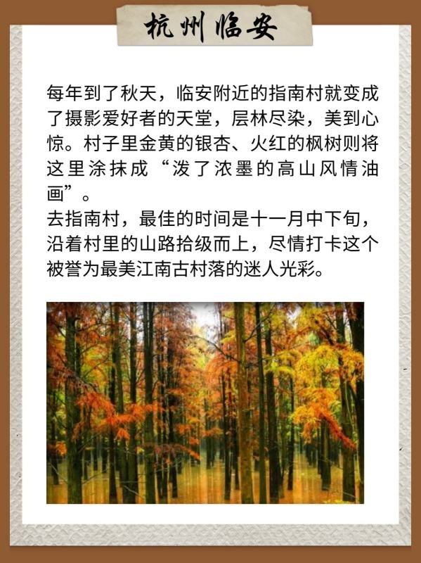 每年到了秋天,临安附近的指南村就变成了摄影爱好者的天堂,层林尽染,美到心惊。村子里金黄的银杏、火红的枫树则将这里涂抹成“泼了浓墨的高山风情油画”。