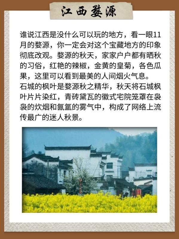 11月的婺源,村民们开始晾晒秋收的农作物,形成了一幅五彩斑斓的画卷。此外,早晨的婺源还常常被薄雾所笼罩,宛如仙境一般。在这里,你可以欣赏到篁岭的晒秋、江岭的红叶、思溪延村的古建筑等美景。