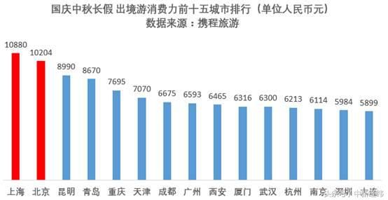 出境游消费力排名前十五的城市分别为上海、北京、昆明、青岛、重庆、天津、成都、广州、西安、厦门、武汉、杭州、南京、深圳、大连。其中,北京、上海两个“超一线”城市出境游消费超过万元。