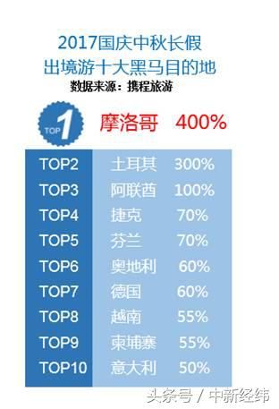 同时,今年黄金周还涌现出了一批“黑马”目的地赢得中国游客青睐,分别是:摩洛哥(400%)、土耳其(300%)、阿联酋(100%)、捷克(70%)、芬兰(70%)、奥地利(60%)、德国(60%)、越南(55%)、柬埔寨(55%)、意大利(50%),增速达到50%以上。其中前8个都是长线国家。中欧、北欧、中东、东南亚更多目的地被中国游客选择。